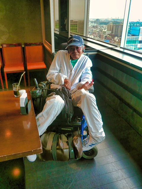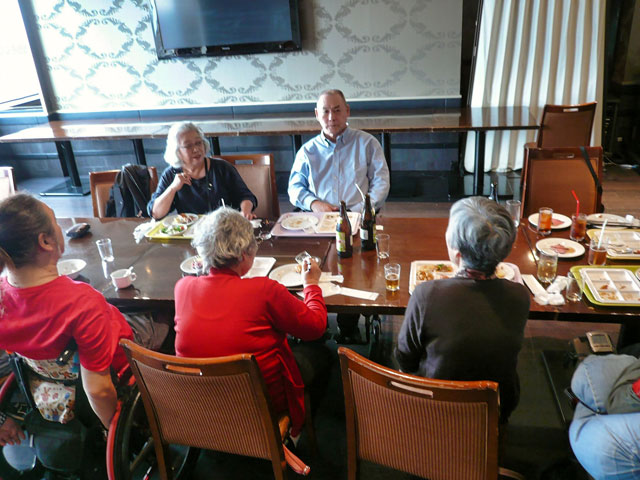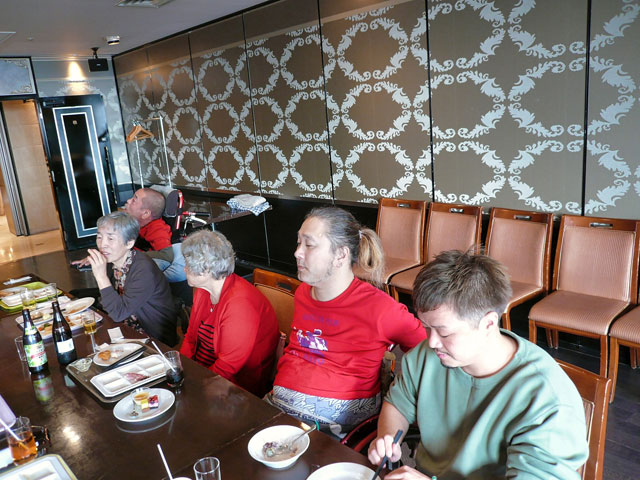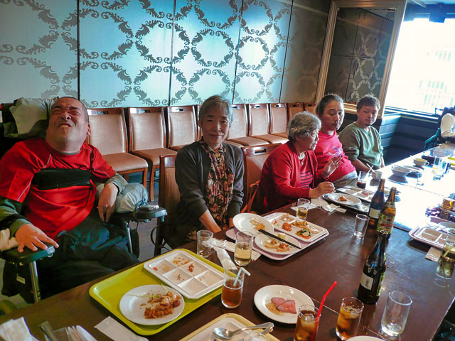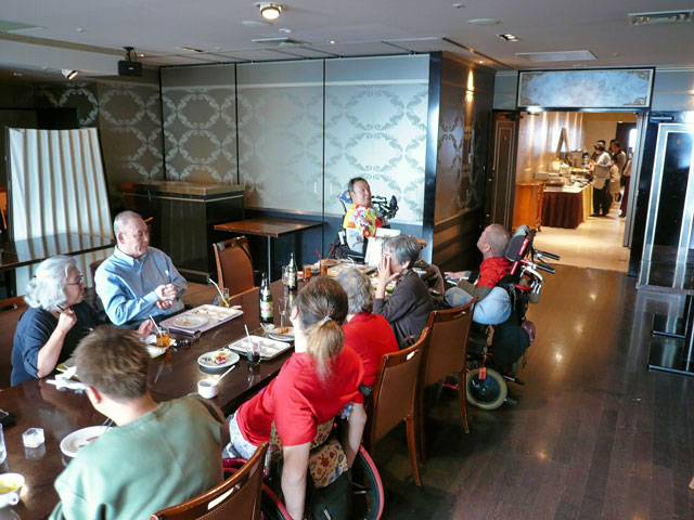 写真奥のK.Hさんの電動車いす、最新の制御装置が備えられています。 右奥に見えるところに料理が並んでいます。 今回は一番近い部屋だったので、食べ物もすぐに取りに行けてよかったです。 |