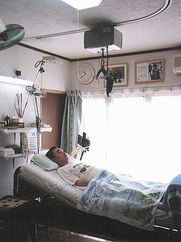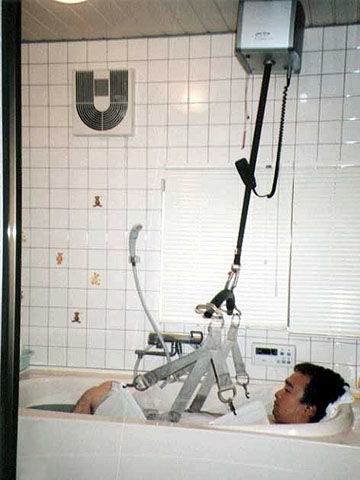 洋式の浴槽を設置しています。ハンモック式のネットにぶら下がって、リフターで浴室まで移動して少し横になった状態で入浴します。入浴中もリフターにぶら下がった状態なので、安定していて安心です。