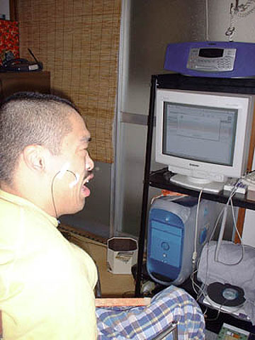 1入力装置はキネックスを使用しています。スイッチは頬に光ファイバーの先端部分をテープで固定し、舌で頬を持ち上げて光を遮断すると操作できます。