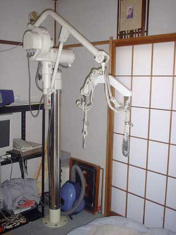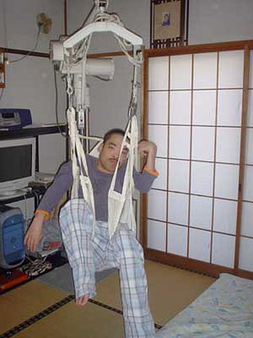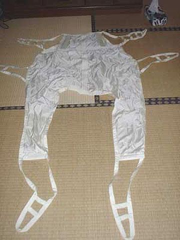 スリングシートを使用し、リフターで吊られた状態です。 見た目は楽そうですが、吊り上げられた本人はけっこうキツイです。 皆さんもチャンスがあったら是非体験してみてください。