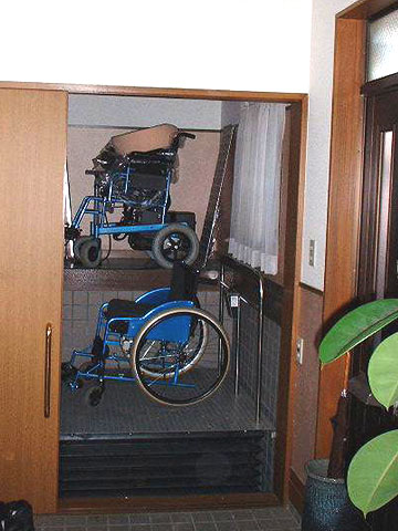 段差解消機で上に上がり室内用の車いすと乗り換えます。その際