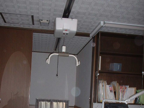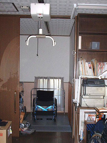 天井走行リフターを段差解消機の上まで移動して身体を吊り上げ、寝室まで移動(約2メートル)します。寝室は段差解消機の設置してあるすぐ隣に位置します。