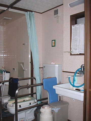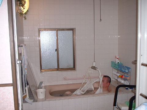 シャワーチェアーで浴室に入り、洗体後浴槽に入ります。浴槽に入る時はリフターを使用する事により、