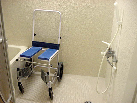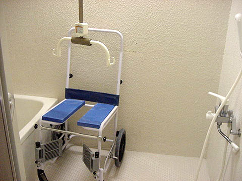 ベッドからリフターを使ってシャワー椅子に座ります。シャワー椅子を洗い場に置く場合は、洗い場が平らではないので、シャワー椅子が平らになるように、車輪の下にゴム板をはかせたりします。